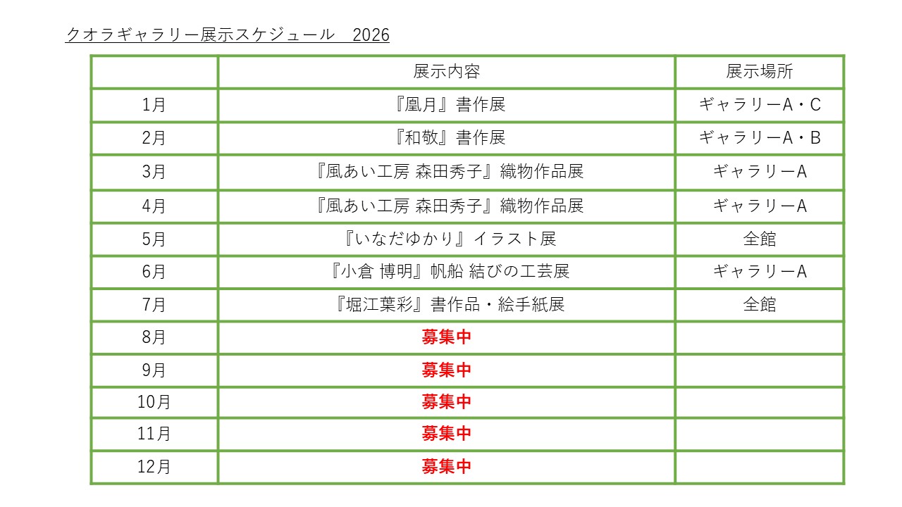 クオラギャラリーは、地域の作家、アーティスト、クリエイターの皆様、又は目指す学生さんを応援し、発表の場としてお使い頂いております。